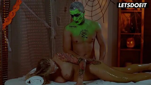 Halloween-themed massage turns into sensual sex for a beautiful blonde babe