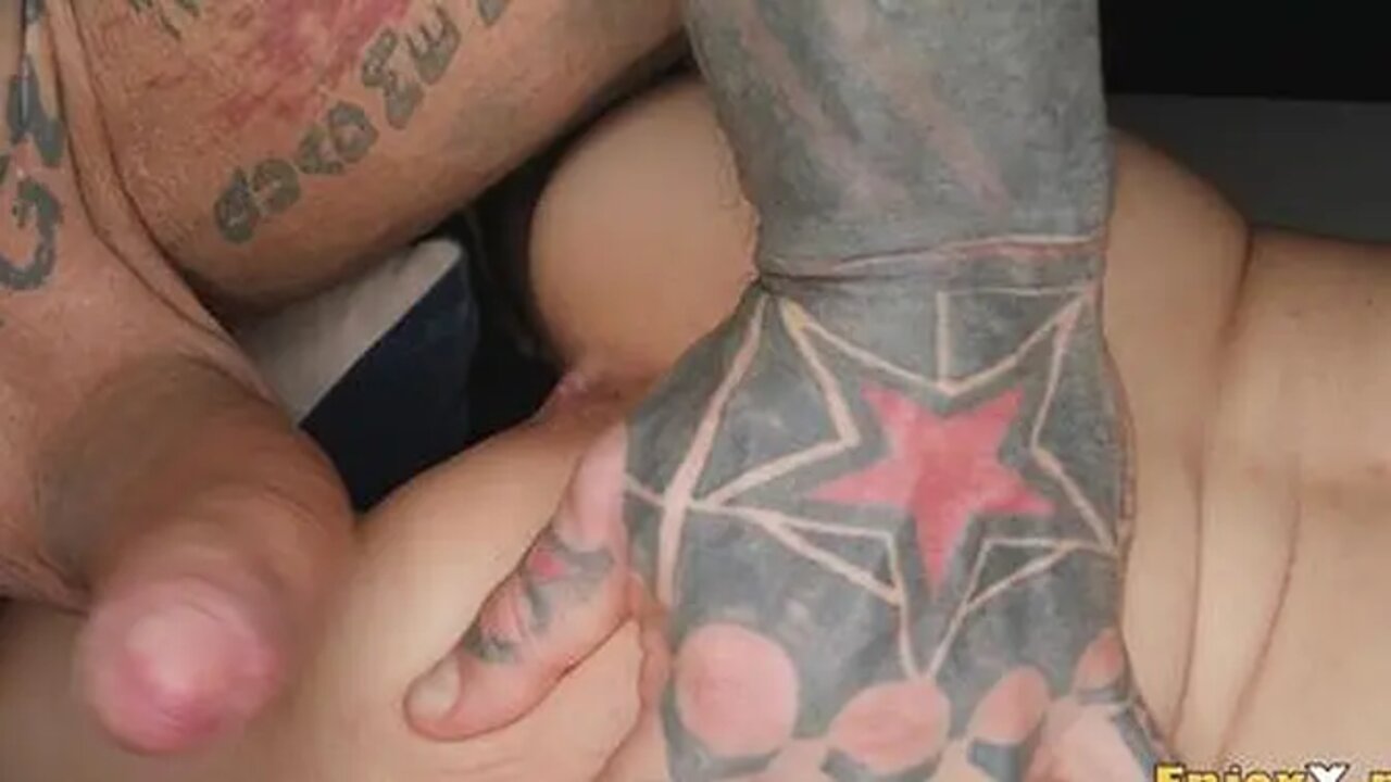 Tattooed stud pounds brunette's bald pussy in hardcore session